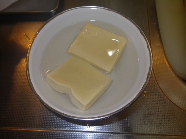 - 高野豆腐はぬるま湯に一晩つけて戻してから、新しい水につけて手で挟んで絞り、濁りがなくなるまで繰り返してから、水気を絞って6等分に切ってください。