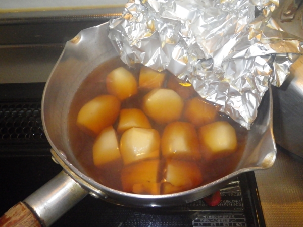 - 煮立ったら弱めの中火にしてアルミホイルで落しぶたをして3~4分くらい煮てください。