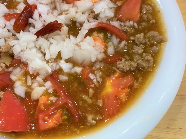 麻婆豆腐の豆腐のかわりにトマトを使った一品。豚ひき肉とトマトの旨味が際立つ美味しさです。トマトの酸味が爽やかな辛さを作り出しています。生の玉ねぎもいい食感。白いご飯にもよく合います。参考にしたのは「NHKきょうの料理・2021年8月号」から栗原心平さんの料理レシピです。