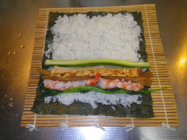- 巻いた海苔巻きを取り出し、先ほどと同じようにすし飯を広げ、具材と最初に巻いた海苔巻きを置き、一気に巻いてください。