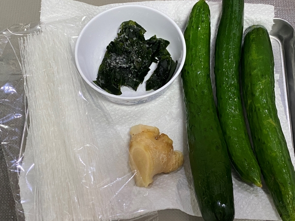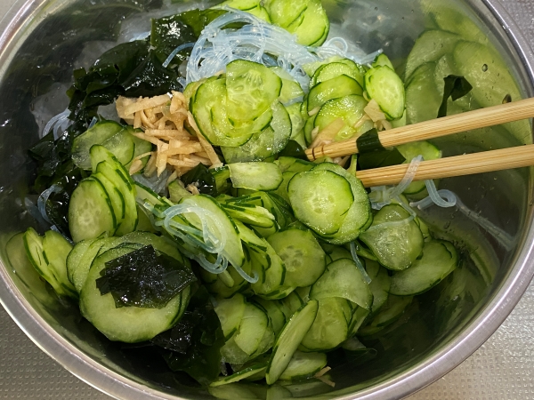 - 調味料としょうがを入れてボウルに、春雨、きゅうり、わかめを入れて和えたら出来上がりです。